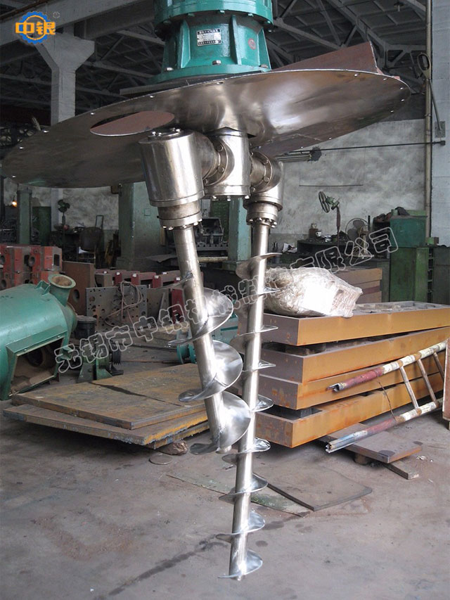 雙螺旋錐形混合機的攪拌部件為兩條不對稱懸臂螺旋,長短各一,它們在繞自己的軸線轉動(自轉)的同時,還環繞錐形容器的中心軸;借助轉臂的回轉在錐體壁面附近又作行星動(公轉);該設備通過螺旋的公、自轉使物料反復提升,在錐體內產生剪切、對流、擴散等復合運動,從而達到混合的目的。產品可根據要求設計外夾套(加熱、冷卻),噴霧器,廣泛應用于化工、醫藥、農藥、染料、建材等粉體與粉體的混合、反應。 該機根據工藝要求可在混合機筒體外增加夾套,通過向夾套內注入冷熱介質來實現對物料的冷卻或加熱;冷卻一般泵入工業用水,加熱可通入蒸汽或電加熱導熱油。